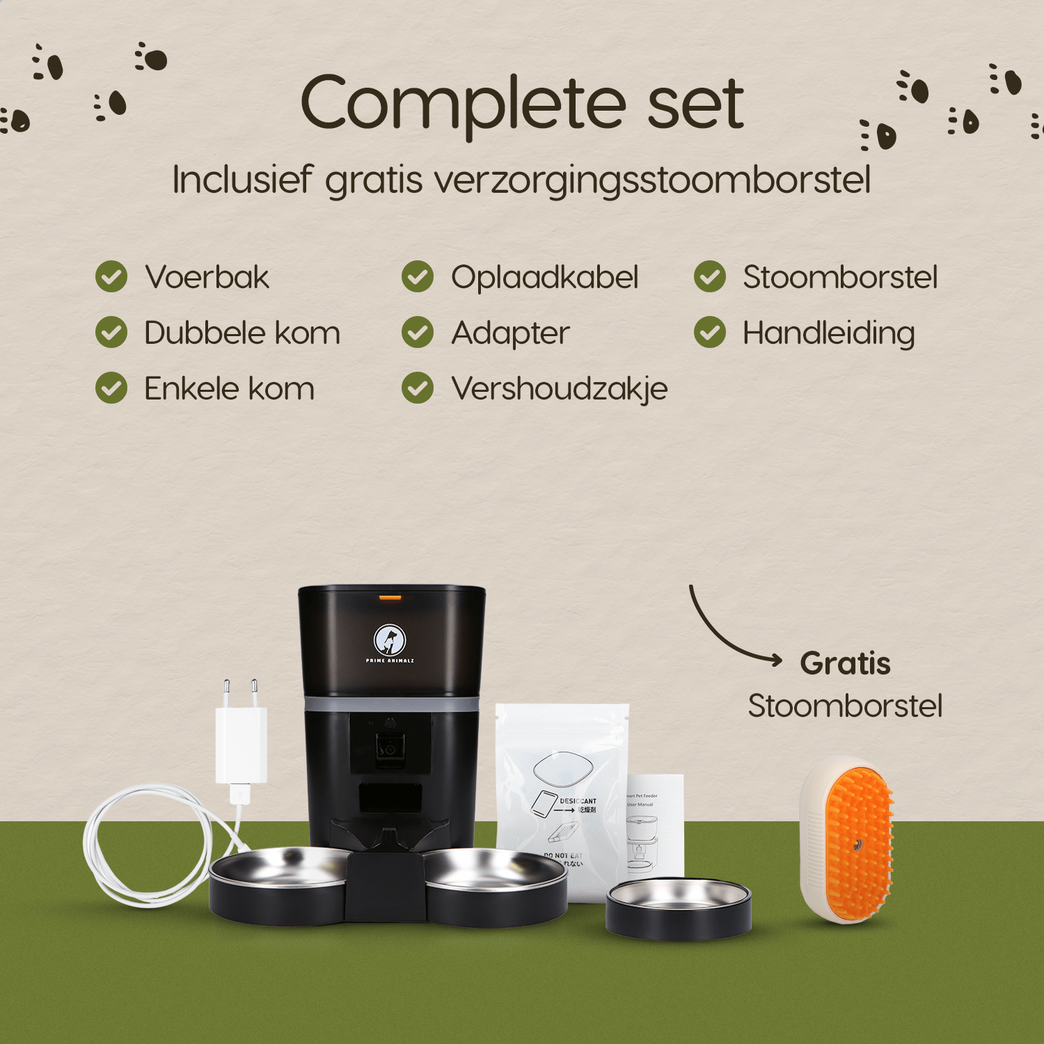 Om het helemaal af te maken, krijg je bij iedere bestelling een cadeautje! Als je een voederbak bestelt, ontvang je een gratis elektrische massageborstel met spray erbij, zodat je jouw huisdier extra kunt verwennen.