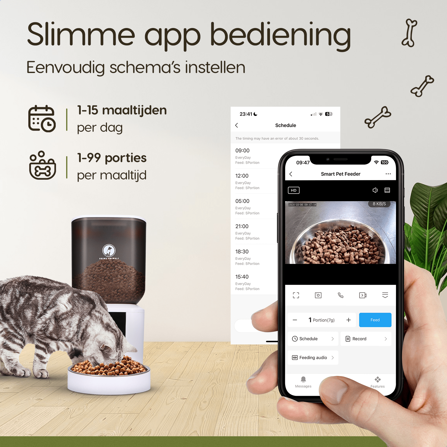 Met de handige app stel je eenvoudig het voedingsschema en de portiegroottes in, zelfs als je onderweg bent. De app stuurt je meldingen wanneer jouw huisdier heeft gegeten, zodat je altijd op de hoogte bent van hun eetpatroon.