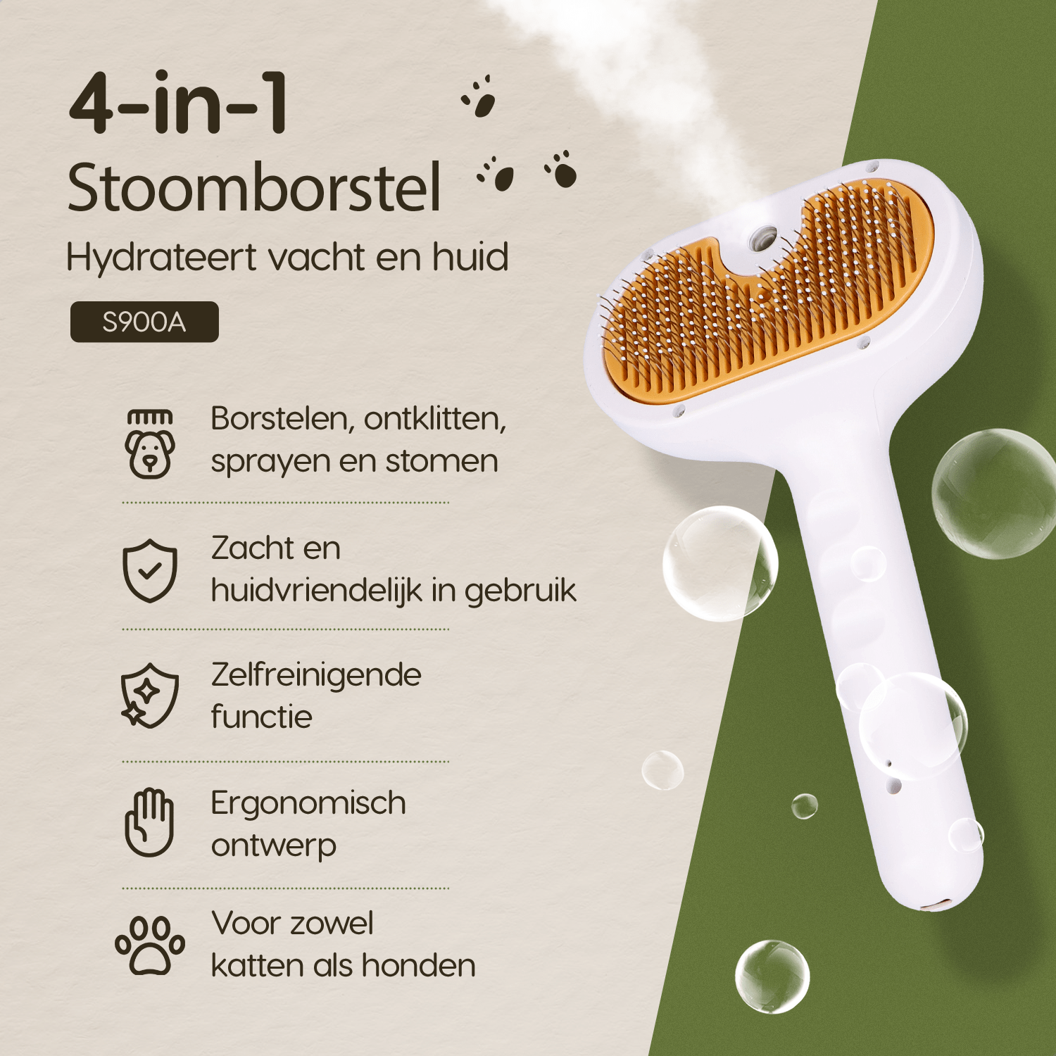 De stoomborstel S900A premium combineert zachte stoom met hoogwaardige roestvrijstalen tandenknoppen. Deze zorgen voor een diepere en effectievere verzorging dan standaard borstels. De stoom maakt de haren soepel en hydrateert de vacht, terwijl de RVS tanden klitten en losse haren eenvoudig losmaken zonder te trekken.