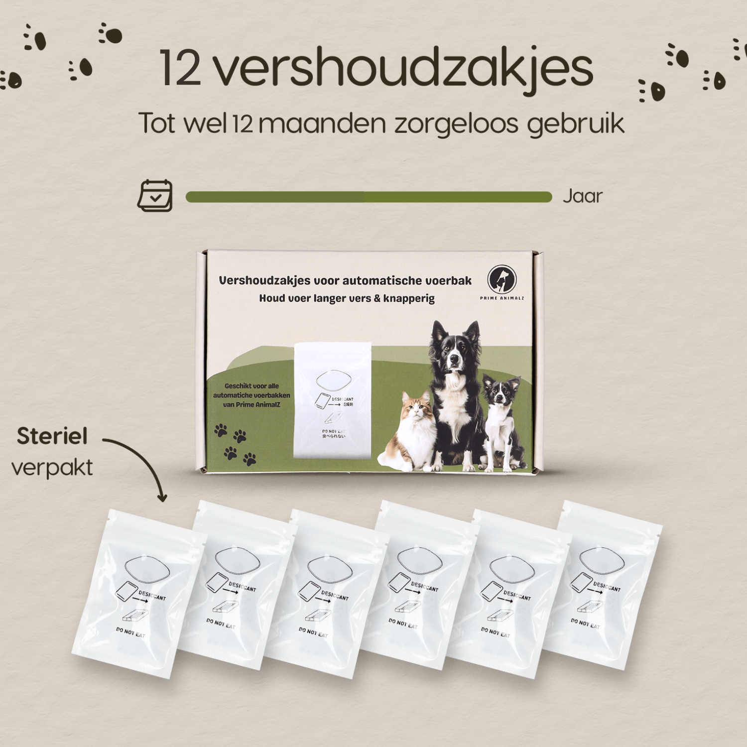 Met de Prime AnimalZ Verhoudzakjes zorg je voor knapperige en smaakvolle brokken voor jouw trouwe viervoeter, elke dag weer. Bestel nu jouw 6 vershoudzakjes en ervaar zelf het gemak en de kwaliteit van deze onmisbare aanvulling op jouw automatische voerbak!
