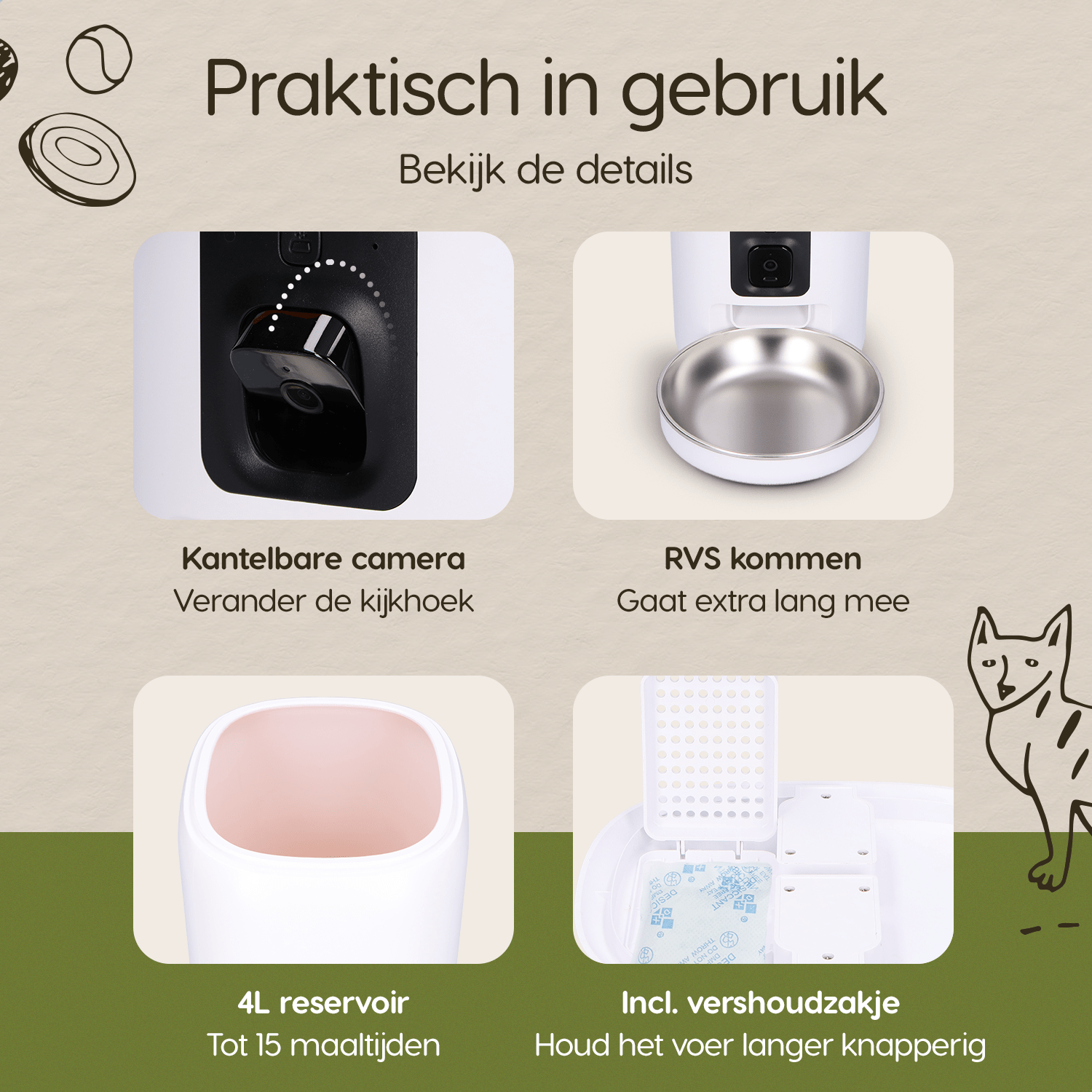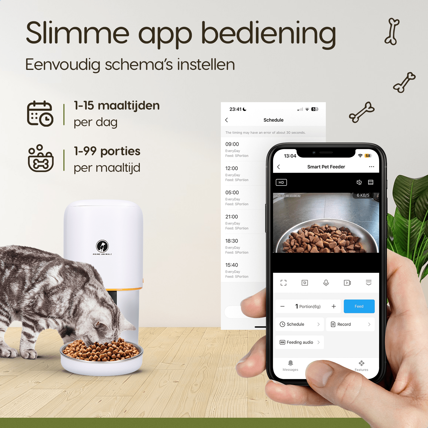- Handige app-bediening: Stel de porties en schema’s in via je smartphone waar je ook bent.