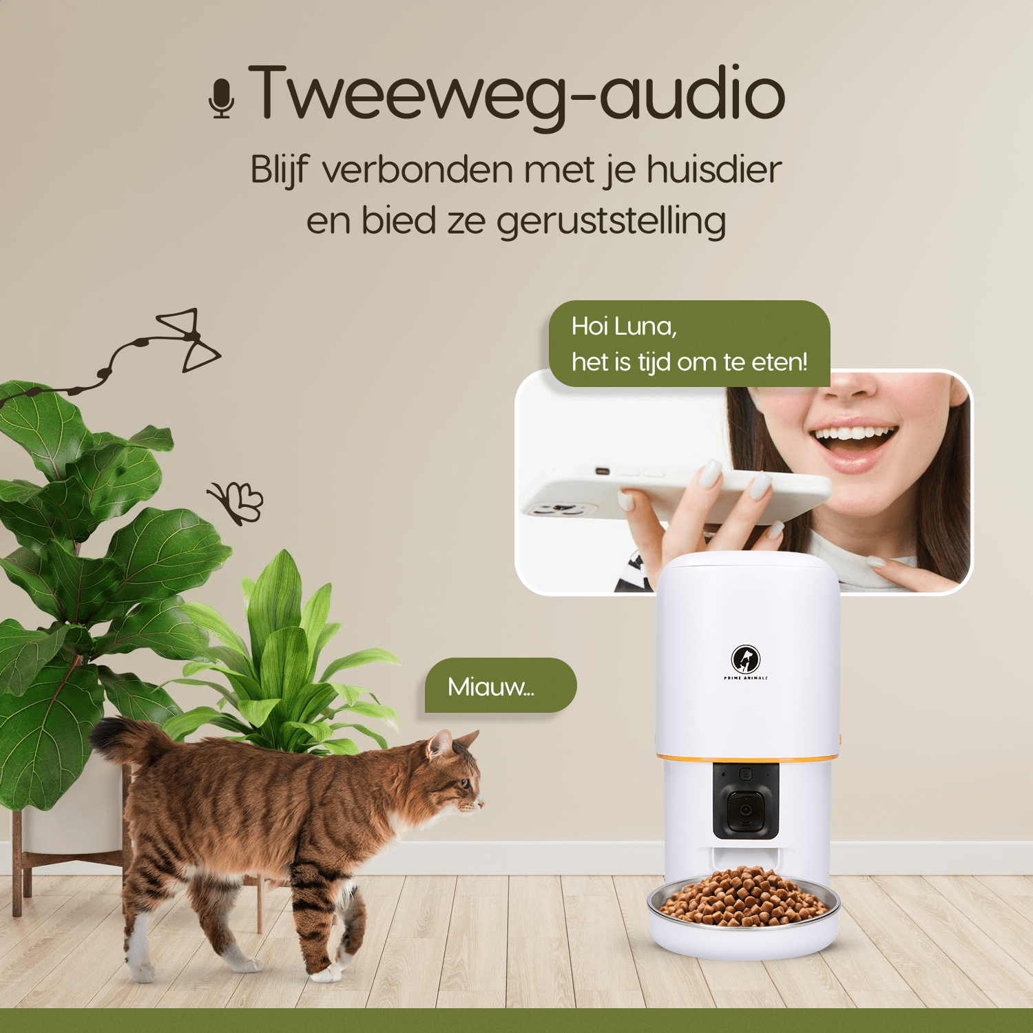 - Persoonlijke spraakopname: Laat je huisdier gerust weten dat het etenstijd is met jouw stem.