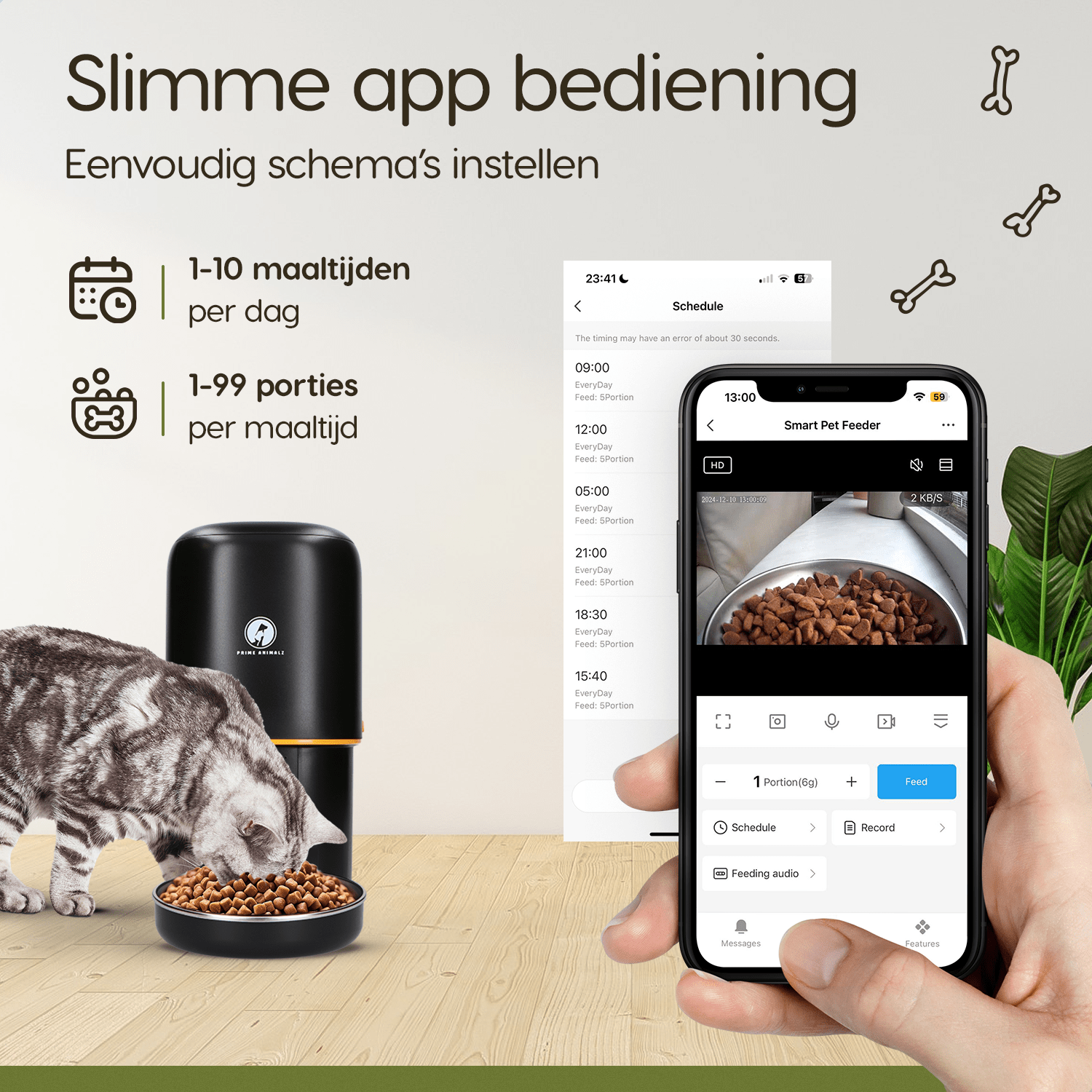 - Handige app-bediening: Stel de porties en schema’s in via je smartphone waar je ook bent.