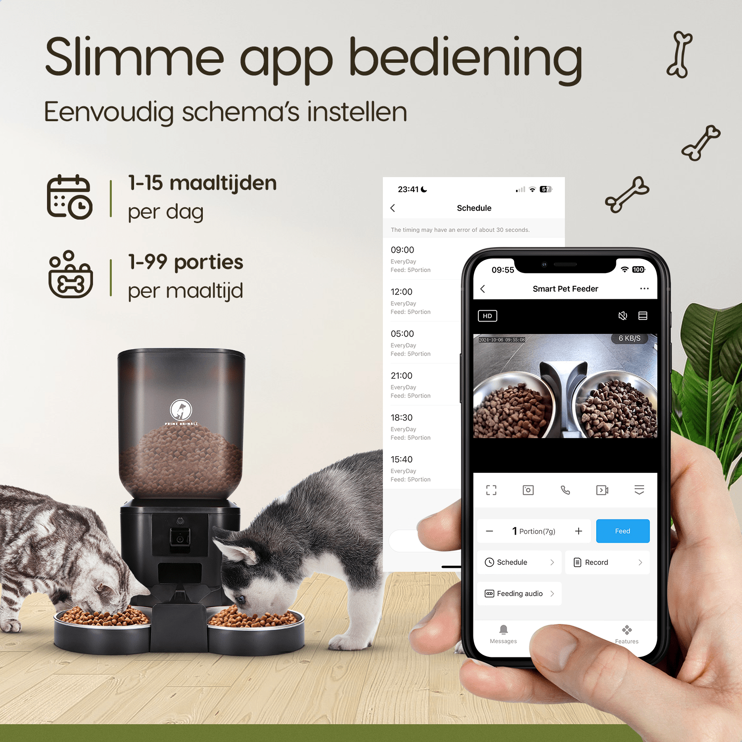 Met de handige app op je smartphone stel je eenvoudig voedingsschema’s in en pas je portiegroottes aan, zelfs op afstand. Of je nu op werk bent of onderweg, je hebt altijd controle over de voeding van je huisdier. De app stuurt real-time meldingen, zodat je weet wanneer en hoeveel jouw huisdieren hebben gegeten.