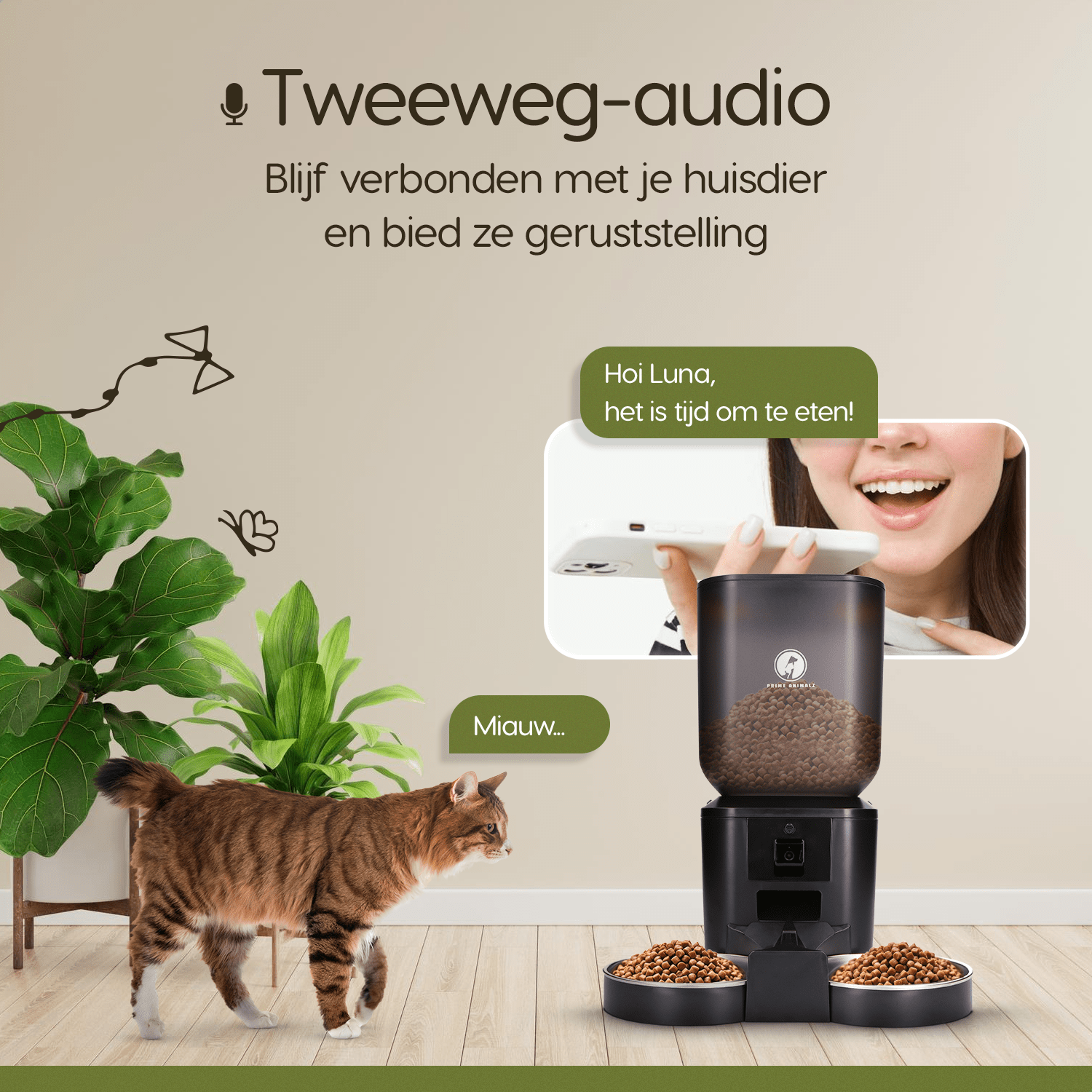 De Prime AnimalZ Voerbak is uitgerust met tweerichtingsaudio, waarmee je op afstand met je huisdier kunt praten. Of je nu op werk bent of onderweg, je kunt je huisdier geruststellen of met ze communiceren, waardoor ze zich nooit alleen voelen.