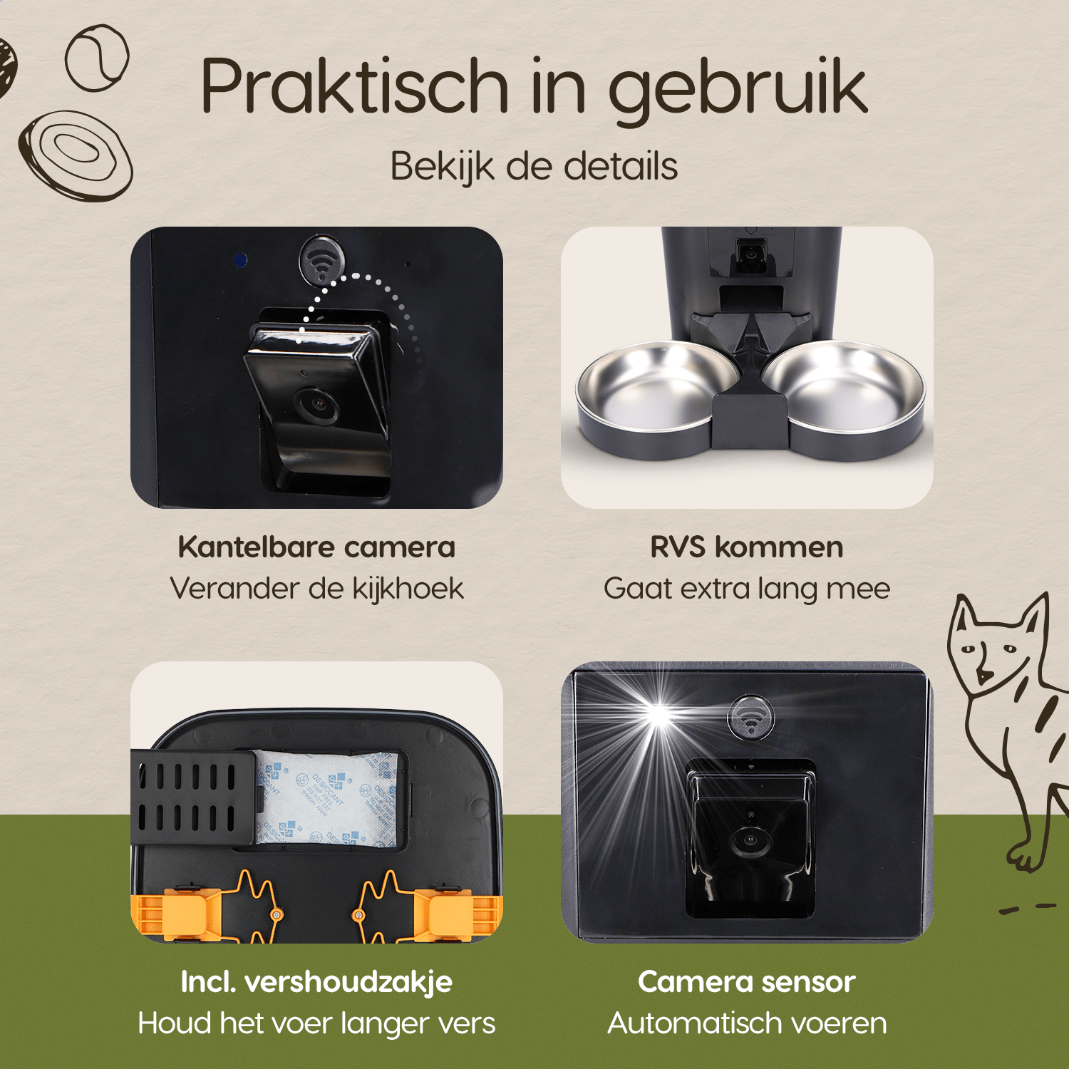 Met de ingebouwde camera houd je jouw huisdieren altijd in de gaten. De nachtzichtfunctie zorgt ervoor dat je zelfs in het donker duidelijk beeld hebt, zodat je op elk moment van de dag kunt zien hoe het met je huisdieren gaat via de de app.